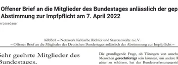 • Das Netzwerk "Kritische Richter und Staatsanwälte" (KRiSTA) hat einen offenen Brief zur geplanten Impfpflicht an alle Bundestagsabgeordneten geschickt. Er steht zum Download und darf frei verteilt werden: