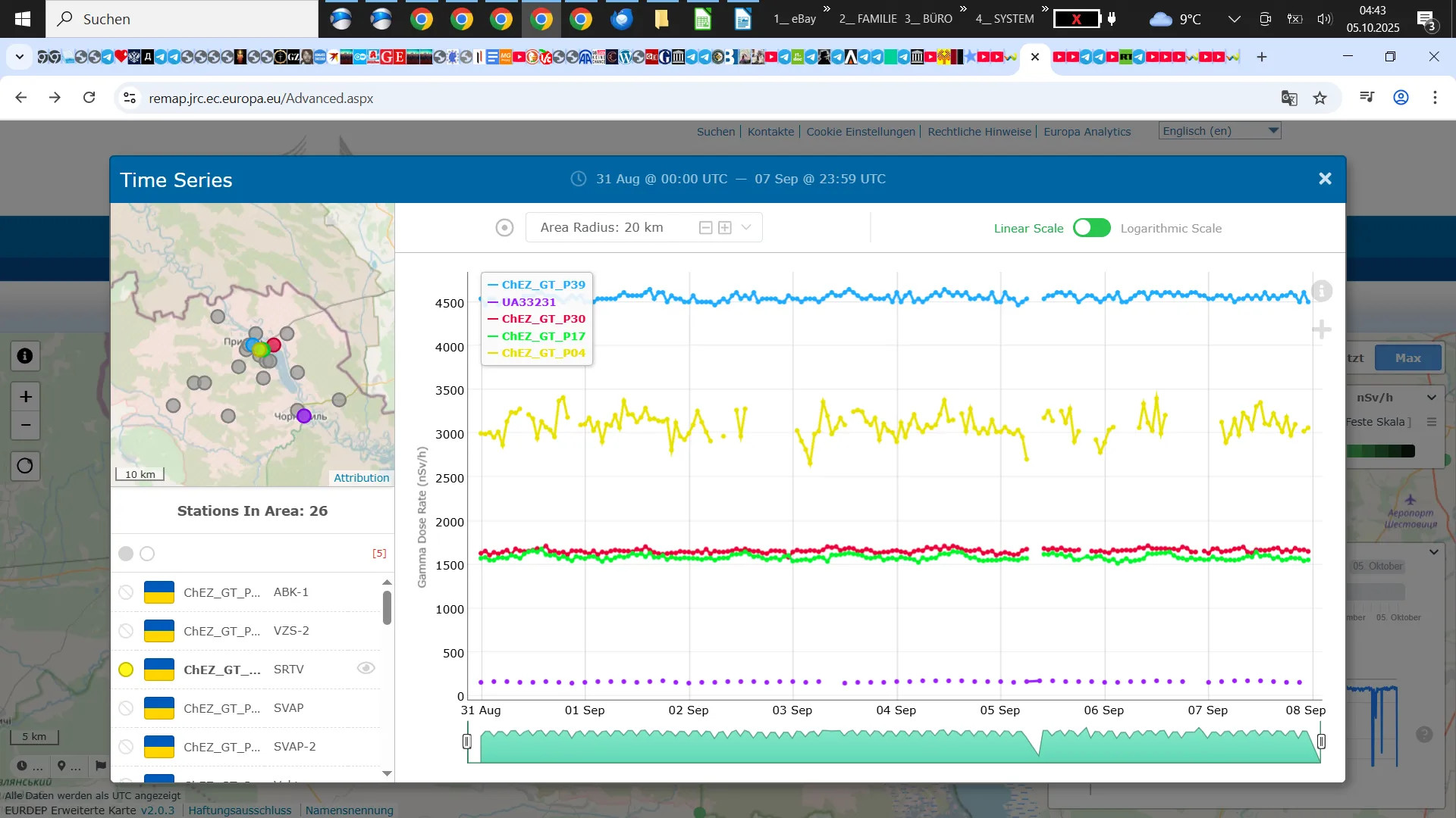 Man sieht, dass es um Tschernobyl 26 Messstellen gibt. Der Messpunkt Tschernobyl hat nur eine normale Strahlung von unter 200.