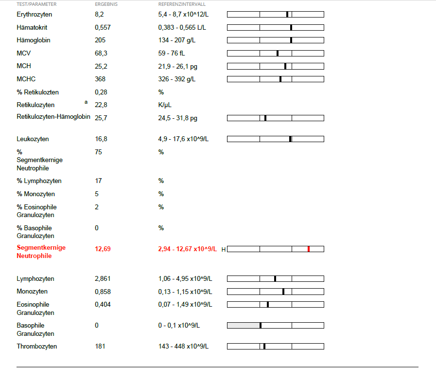 Was sind Segmentkernige Neutrophile, und was kann ich tun, um den Wert von 12,69 (liegt in der Mitte des roten Bereichs) zu senken?