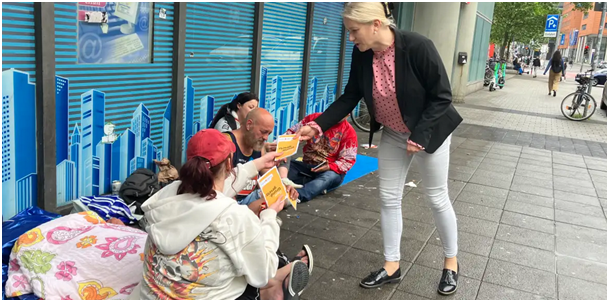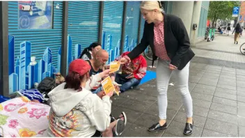 Auf der Nordseite des Bahnhofs unterwegs: Justizministerin Kathrin Wahlmann (SPD) verteilt das Grundgesetz an Tippelbrüder.