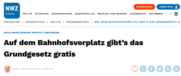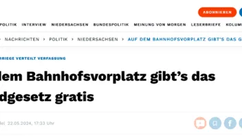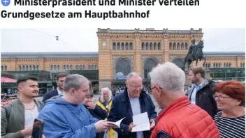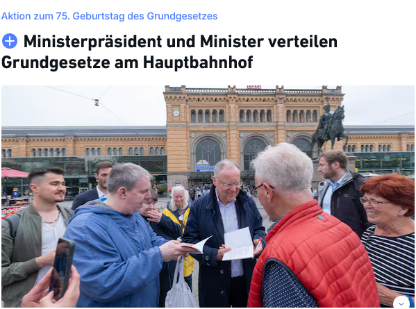 Deutschland feiert 75 Jahre Grundgesetz. Die Regierenden stehen Kopf und überschlagen sich in Lobgesängen und Frohlocken. Mehr noch, sie nehmen ein Bad in der Menge und ... verteilen kostenlos Exemplare unseres Grundgesetzes! Wie beispielsweise in Hannover am Bahnhofsplatz am 22. Mai mit 2.000 Exemplaren: