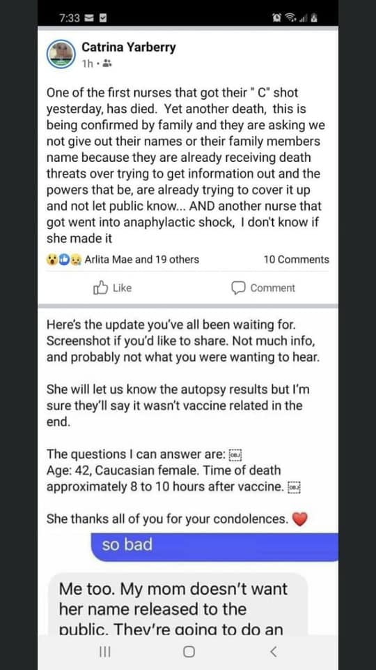 Weiteren Berichten zufolge (vom gleichen Tag) sollte es der Krankenschwester wieder gut gehen. Es soll sich um keine Anaphylaxie gehandelt haben, sondern um einen "einfachen Ohnmachtsanfall".