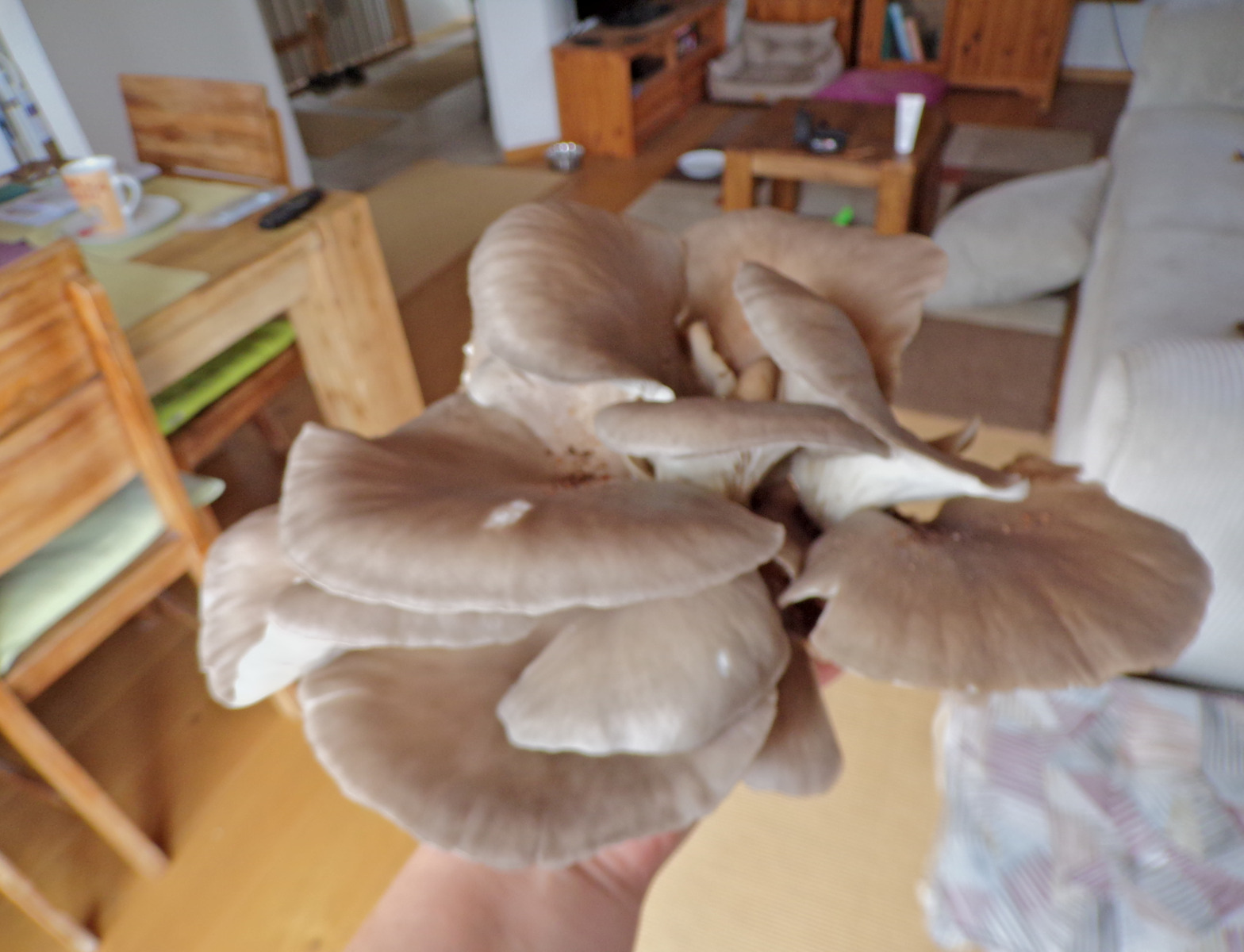 Schön und gut, aber wir haben von Mitte Oktober bis Mitte Ferbruar keine Sonne hier, weil wir am Südhang wohnen. Dafür haben wir die mutmaßlich Vitamin D- reichsten Pilze im Garten auf Buchenstämmen, die Austernsaitlinge, die den ganzen Winter über immer wieder schön nachwachsen. Und unsere Steinchampignons wachsen eigentlich auch lieber schattig.
