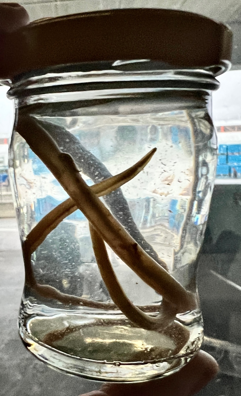 Es müssten Eier zu finden gewesen sein, ich soll „wo ich denke“ das es ein Wurm ist in eine Probe tun und mit Wasser auffüllen.