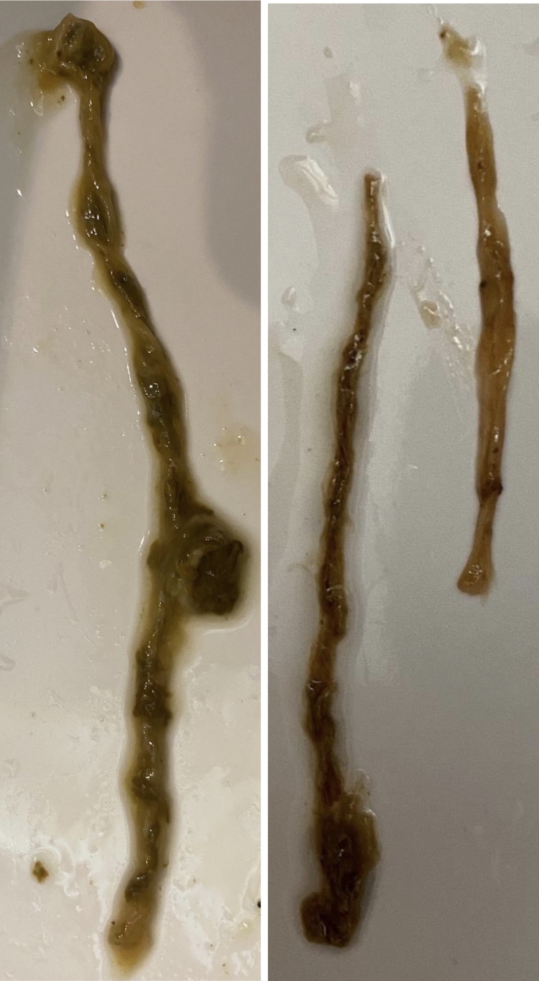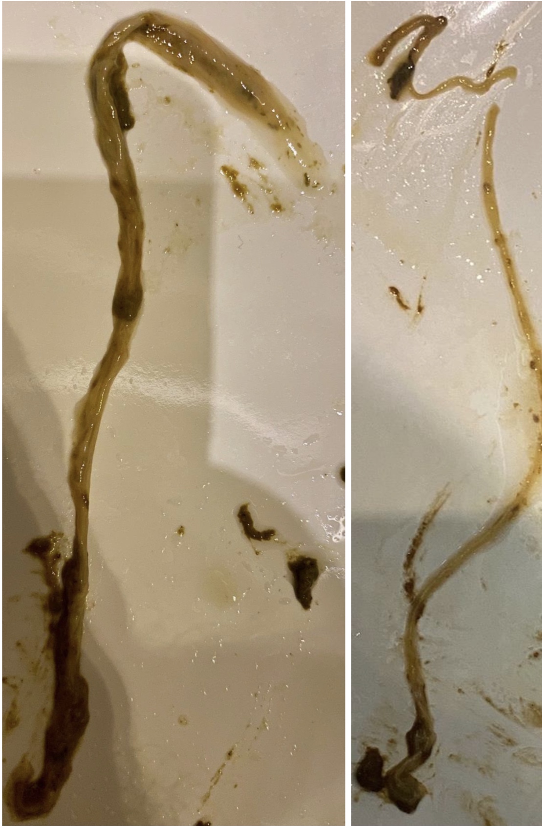 Bei Einläufen kam auch manchmal eine wurmartige Substanz heraus, meine Hausärztin meinte aber dass das Rückstände von Darmhaut wie es bei entzündlichen Darmerkrankungen vorkommt sind.