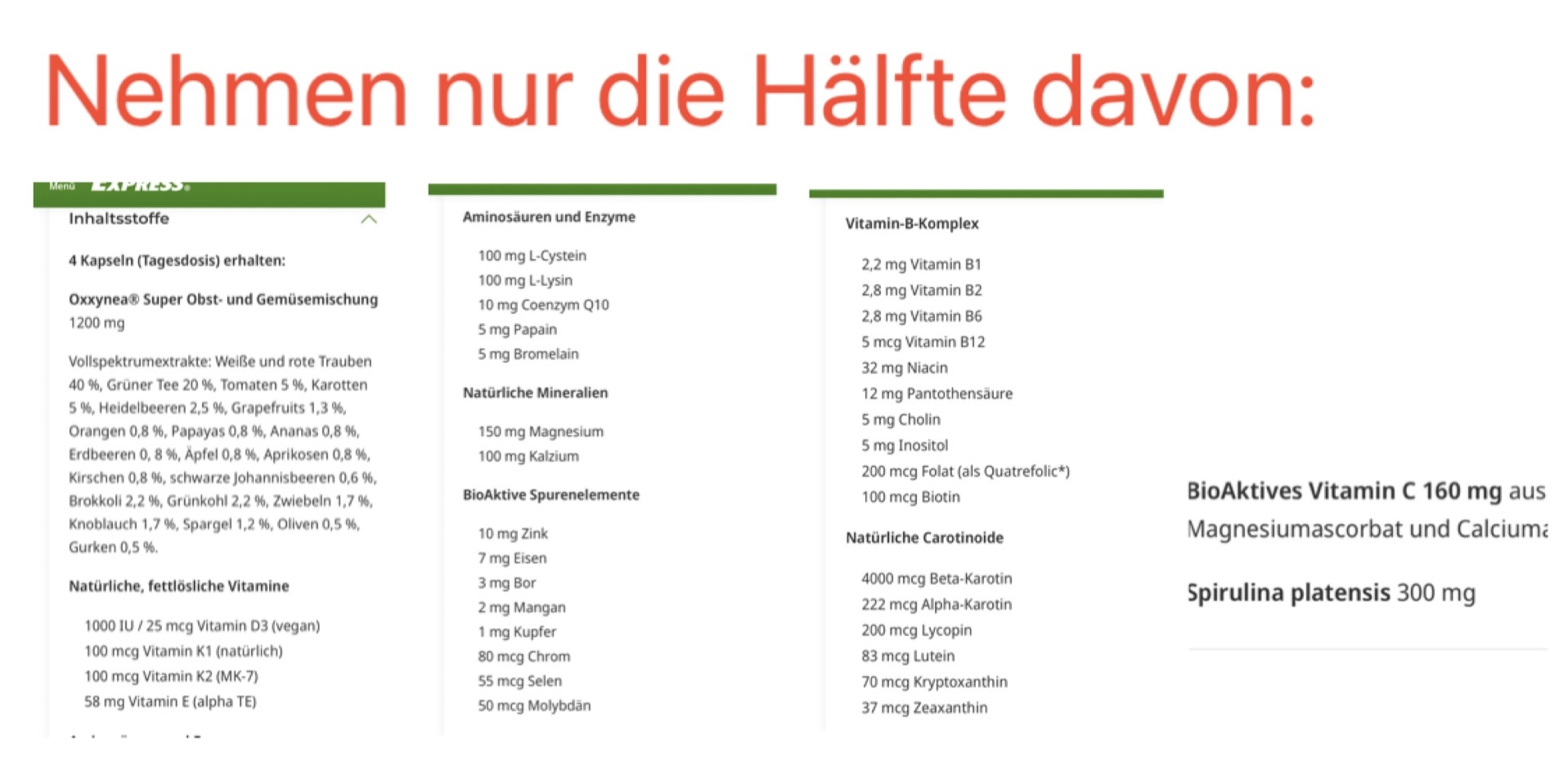 Wir führen noch weitere Nahrungsergänzung zu: normalerweise Vitamin D plus k2 (Wert D aktuell aber zu hoch), ebenso Vitamin B-Komplex da Vegi (pausiert, da B12 zu hoch), Curcumin, Vitamin C, Ingwer, Selen, Zink, Reishi, Corddyceps, Omega3, Astaxanthin.