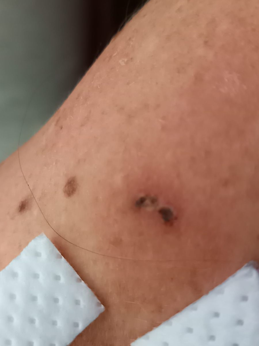 Nach etwa 14 Tagen ist nun ein „Gewebskeil“ aus der Hautstelle herausgefallen nach Verkrustung.