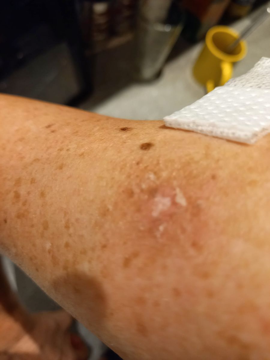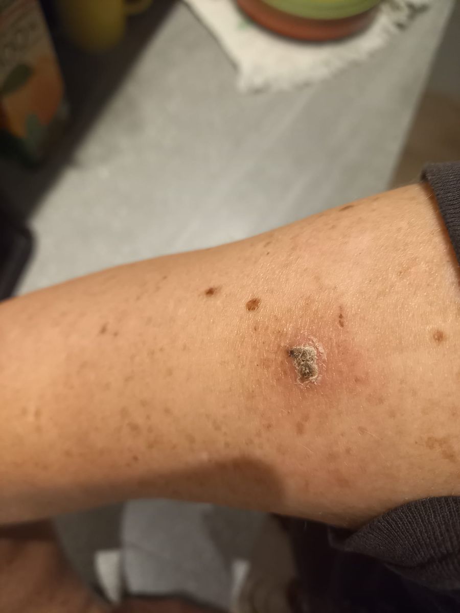 Das Ausgangsbild ist, wo das Pflaster unter der Rötung ist. Meine Freundin meinte, sie habe vor der Behandlung mit der schwarzen Salbe keine Scherzen im Arm gehabt. Die Schmerzen seien wechselhaft in der Entwicklung gewesen: Am Anfang, als sich durch die Anwendung das angelöst hat, seien die Scherzen sehr stark gewesen, als es trocken wurde seien die Schmerzen ein paar Tage weggewesen und als der Zellkeil dann rausgefallen sei, seien die Schmerzen wieder stärker. Sie habe aber das Gefühl, das nicht alles rausgefallen ist.....