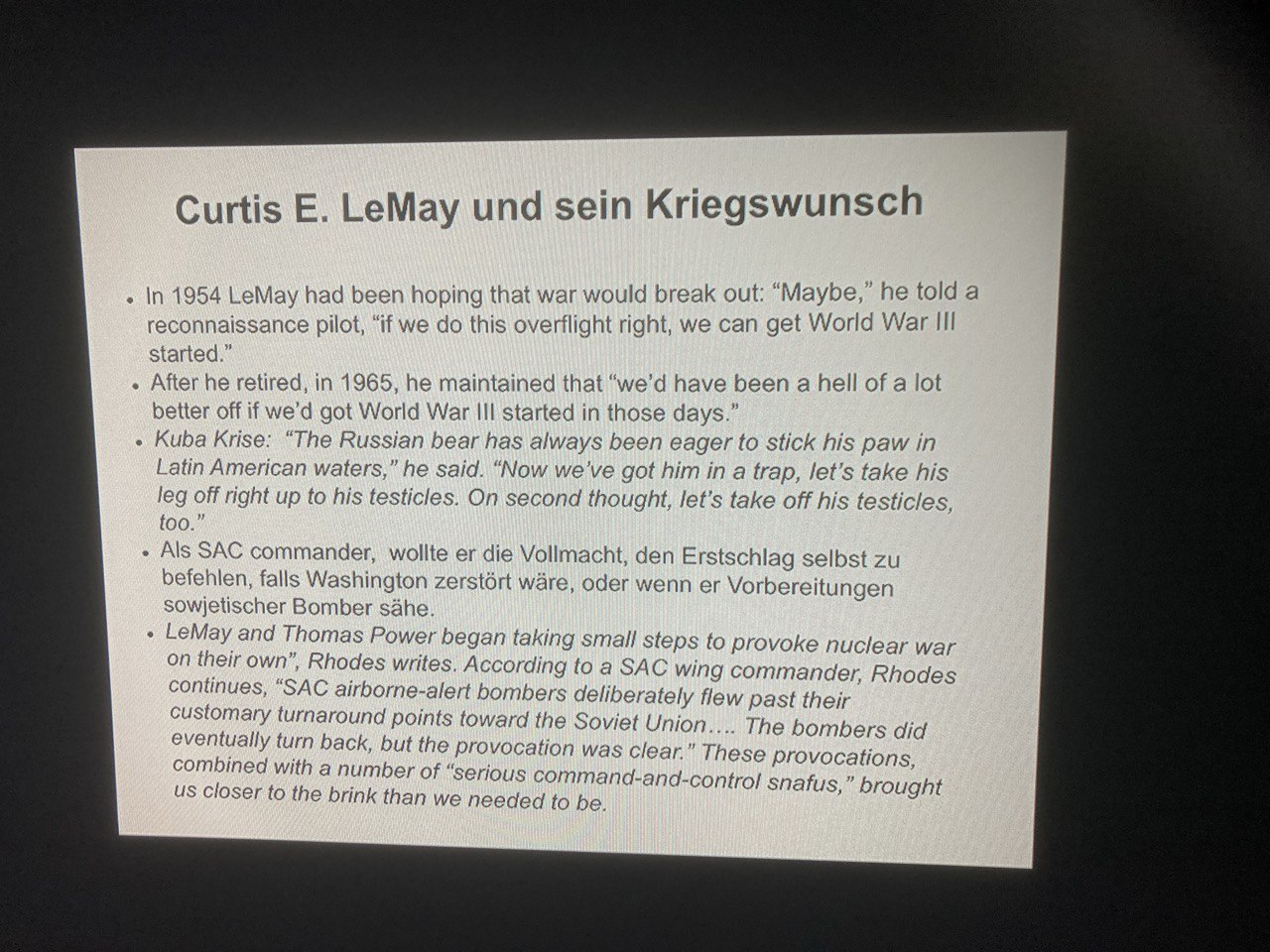 Zum Thema USA und Dritter Weltkrieg. Die US Generäle haben in den 50ern immer wieder Atom Bomber über. Den Nordpol in Richtung Sowjetunion geschickt und den Luftraum verletzt. Damit sollte erreicht werden das die angegriffen oder abgeschossen werden um einen Grund zu haben den Atomkrieg zu beginnen. Präsident Eisenhower wurde dabei ganz gezielt nicht informiert. Als das rauskam hat er dann veranlasst das zumindest jeder Flug von ihm genehmigt werden musste. Das führte dann auch zu seiner Friedensrede am Schluß seiner Präsidentschaft.