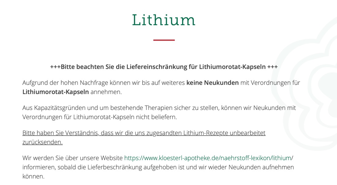 - Wechselwirkungen: Da Lithium mit vielen Medikamenten interagieren kann, darunter gängige Medikamente wie Blutdrucksenker, Antidepressiva und NSAIDs, ist eine ärztliche Kontrolle notwendig, um potenziell gefährliche Wechselwirkungen zu vermeiden.