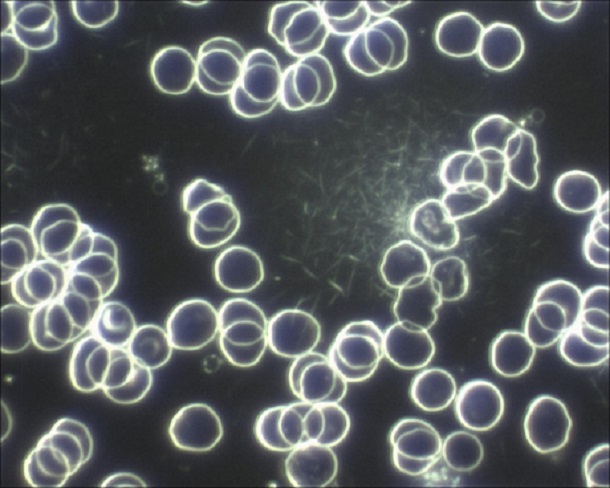 In dieser Aufnahme (ca. 20 Minuten nach Abnahme), sehen Sie, dass die roten Blutkörperchen nicht mehr alle ganz „rund“ sind. Zudem sehen wir zunehmend mehr kleine „Striche“ / Stäbchen die sich bilden.