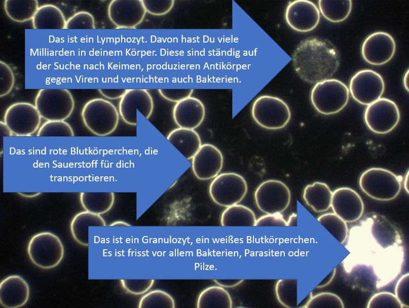 In dieser Aufnahme habe ich für Sie einige Blutbestandteile beschrieben, die Sie im Dunkelfeld sehen können.